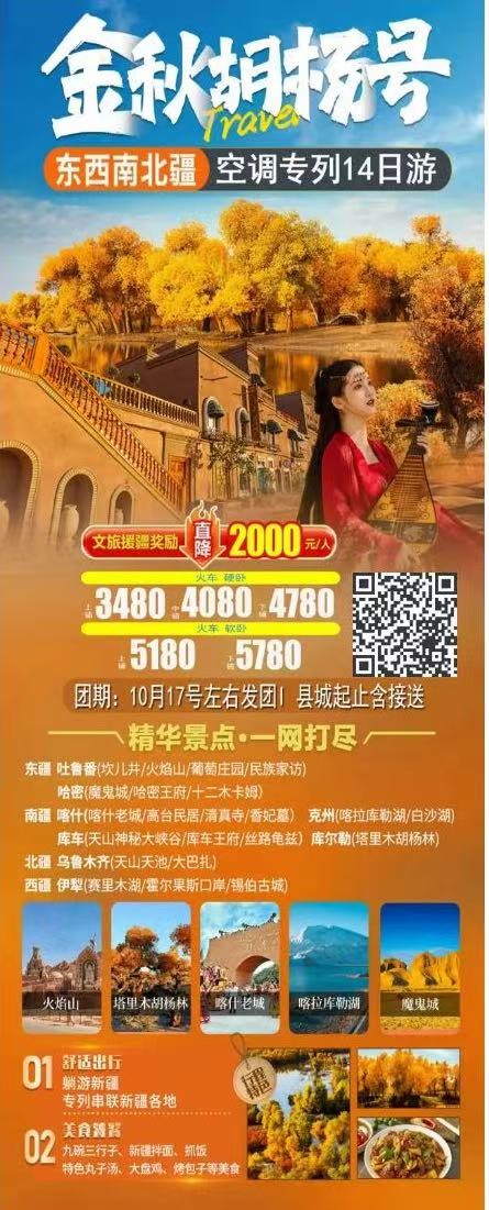 新疆--【金秋胡杨号】东西南北疆空调专列14日游