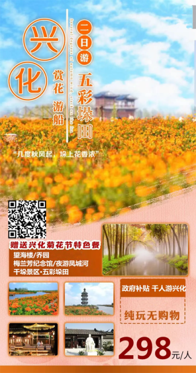 江苏--【赏菊品蟹 游江南 政府补贴298/人 纯玩无购物】品大闸蟹●赏千垛菊花景区●泰州纯玩两日游