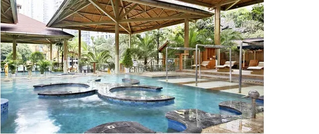 我们是名副其实的温泉酒店哦,海棠晓月养生泉建立在昔日的古巴渝十二景之一“海棠烟雨”旧址,温泉采自地下3000米深处的深层热水,属硫酸钙镁型,水温52.8℃,日流量2500吨,拥有52个天然温泉泡池。