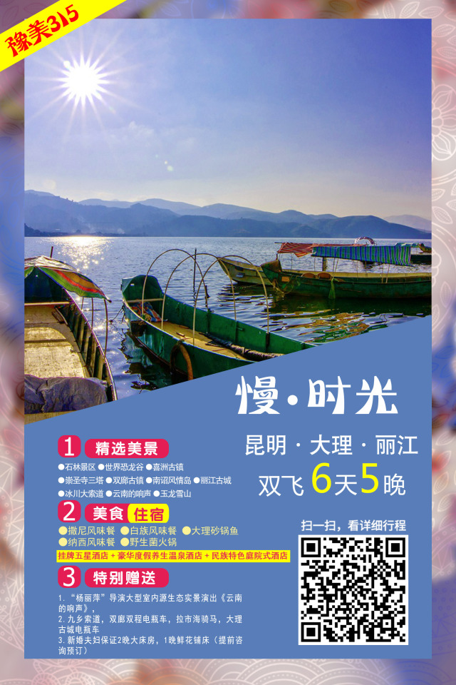 4、 初上高原的贵宾,请注意不要剧烈运动和饮酒,今天没有安排团体膳食,各位贵宾可自行品尝云南小吃。报名时请留下您在旅游期间使用的有效手机号码,方便导游用短信与您联络,力争在机场出站口第一时间能接到您