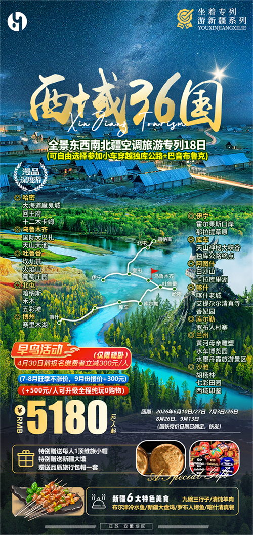 哈密(大海道、回王府、十二木卡姆)/乌鲁木齐 (天山天池)/吐鲁番 (坎儿井、火焰山、葡萄庄园)/北屯(喀纳斯、禾木、五彩滩)/博州 (赛里木湖) /伊宁 (霍尔果斯口岸、那拉提) /库尔勒(罗布人村寨)/库车 (天山神秘大峡谷)/沙雅(沙雅胡杨林、七彩田园、西域印鉴)/阿图什(白沙山、卡拉库勒湖)喀什(喀什老城、艾提尕尔清真寺、香妃园) /兰州(黄河母亲雕塑、水车博览园、水墨丹霞)南北疆空调专列17-18日(可自由选择穿越独库公路中南段+巴音布鲁克)