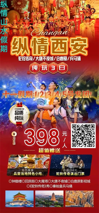 陕西--【纵情西安】398元无必消丨赠送演出丨西安兵马俑+大唐不夜城+白鹿原三日游