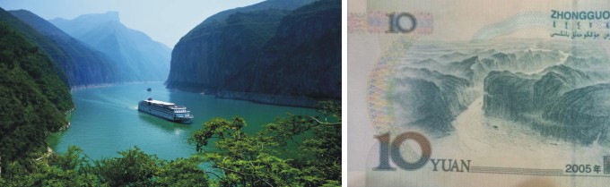 长江三峡由西向东第一峡瞿塘峡,图案为瞿塘峡夔门雄关(青蛙问天),也是10元人民币背后图案