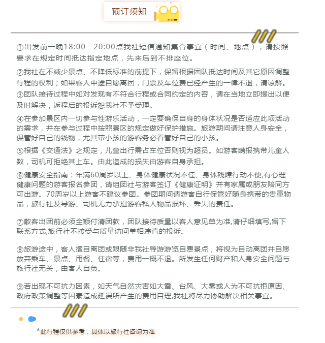 声明:1、本网站上的旅游线路和价格仅供参考,具体价格及发团时间请依电话或到店咨询为准,网购预定用户以工作人员回复确认为准!