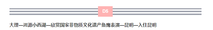 行程概览 各地乘飞机前往昆明、请从A出口或B出口出来以后向左转,走到1号门旁边。我社工作人员在接站牌处迎接您,鲜花接机,您将乘坐我社专用商务车前往酒店,办理入住手续。随后是您的自由行时间,去小巷逛逛,或是昆明的【翠湖】、【东寺塔】、【讲武堂】,此行程为全国散客拼团,这天昆明旅行社会在昆明机场把来自全国乘坐不同航班的贵宾接入酒店,当您入住酒店后要注意休息,做好体力储备,尤其是初上高原的贵宾,请注意不要剧烈运动和饮酒,今天没有安排团体膳食,各位贵宾可自行品尝云南小吃。报名时请留下您在旅游期间使用的有效手机号码,方便导游用短信与您联络,力争在机场出站口第一时间能接到您。 特色美食 早餐:无安排 午餐:无安排 晚餐:无安排 尊享住宿 昆明准五酒店:首选华德酒店、备选润恒、旺穗 行程概览 早餐后,乘车前往国家4A级景区——【九乡风景区】(赠送游船、索道),进入景区后乘观光电梯下行到阴翠峡,乘船游览碧水苍翠的峡谷河流,之后沿着惊魂峡进入九乡地下溶洞区,游览子母瀑布、神田、雄狮大厅等奇观,溶洞有雄、险、奇、美等特点,体量宏大,洞穴粗犷、宏大、空阔、雄伟壮观。出洞后乘索道返回景区大门。午餐后,乘车前往昆明【五甲湿地公园——房车露营基地】(赠送露天BBQ、KTV、派对),参观占地1300亩的自然风光,再现了滇池“翠羽丹霞、三春杨柳、九夏芙蓉”等美景,配合特有的湿地、儿童娱乐项目,营地内可使用免费wifi,后在房车营地内举行露天BBQ、露天KTV、露天派对,尽享慵懒欢快时光。后乘车前往楚雄入住酒店。 特色美食 早餐:酒店自助餐 午餐:九乡叠虹山庄 晚餐:房车营地BBQ 尊享住宿 楚雄准五酒店:首选泰格、备选格瑞时代、世纪星、君丽、昕路大酒店 行程概览 早餐后,前往大理,沿途欣赏风景,抵达大理后游览5A级景区皇家寺院——【三塔·崇圣寺】,三塔位于大理古城西北部1.5公里处,西对苍山应乐峰,东对洱海。它是大理历史上规模最为宏大的古刹,南诏丰佑年间曾有殿宇千间,大理国时期是皇家的寺院。崇圣寺三塔由一大二小三阁组成,三座塔鼎足而立,雄伟壮观。随后特别安排【洱海骑行】,身心飞扬,清风拂面,亲近洱海、融入大理、想停则停,想行即行,尽享慵懒动感时光。午餐品尝大理白族风味餐,接着游览苍洱间最美花海——【花语牧场】(赠送放风筝、微电影),在这里60多种鲜花分分不同的季节开放,全年都有花开,一望无际的花海,仿若人间仙境,在花海中我们特地安排了【花海微电影】、【花海放风筝】,在花丛中自由奔放,一阵阵幽香环绕着你的身周,直至沁人心脾。后乘车前往丽江,入住丽江酒店。 特色美食 早餐:酒店自助餐 午餐:大理风花雪月宫餐厅 晚餐:大理海稍鱼 尊享住宿 丽江准五酒店:首选丽香苑、备选翔鹤、汉邦豪苑 行程概览 早餐后,乘车至丽江,游览世界文化遗产,有着“高原姑苏”之称的【丽江古城】(赠送古维费),古城巧妙地利用了地形,走街入院,古城建筑全为院落民居,房屋构造简单粗犷,而庭院布置和房屋细部装饰丰富而细腻,居民喜植四时花木,形成人与自然的美好和谐。中餐后前往纳西族三垛神化身神山【玉龙雪山】,乘【冰川大索道】一览冰川公园。玉龙雪山是位于中国云南省丽江西北的山脉,是世界上北半球纬度最低、海拔最高的山峰。 下山后特别安排【古城写真】,留下最美好的瞬间,赠送每人10张写真照(电子版),人人都是一朵自由行走的花,生命的巧合、碰撞、缘分都在其中发生,食材与味蕾的偶遇、匠心与造物的相逢、文明与时光的碰撞,各具特色的小店,如繁花盛开。特别安排:PARTY之旅——明星青睐的【古城音乐酒吧】(每人赠送一支啤酒),结束后入住酒店。 特色美食 早餐:酒店自助餐 午餐:冈拉梅朵藏式风味餐 晚餐:云芝御膳堂纳西风味餐 尊享住宿 丽江商务酒店:首选丽香苑、备选翔鹤、汉邦豪苑 行程概览 早餐后,乘车前往大理【洱源小西湖】,一个被人们称之为“高原水乡”的泽国,一个在史籍中被反复提及的“烟渚渔村”,一个有着芦笛泛鲜,苇岸青青的绿色家园,一个六村七岛相望,乘船泛舟【欣赏国家非物质文化遗产鱼鹰表演】。之后乘车返回昆明,抵达后入住豪华温泉酒店,洗净旅途疲劳。(各位亲,记得带漂亮泳衣泳裤哦!) 特色美食 早餐:酒店自助餐 午餐:白族风味餐 晚餐:彝族风味餐 尊享住宿 昆明温泉酒店:首选谷神温泉酒店、备选都市高尔夫温泉酒店 行程概览 早餐后,自由选择前往【游客集散中心】(赠送过桥米线),随后我社工作人员将根据您的航班时间送您至机场,返回温暖的家。 特色美食 早餐:酒店自助餐 午餐:无安排 晚餐:无安排 尊享住宿 无安排