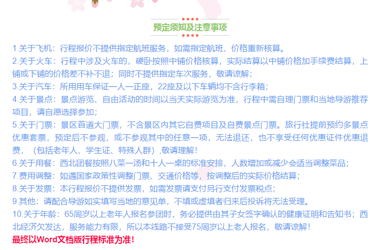 声明:1、本网站上的旅游线路和价格仅供参考,具体价格及发团时间请依电话或到店咨询为准,网购预定用户以工作人员回复确认为准! 2、本公司不接受因价格差异引发的一切诉求! |