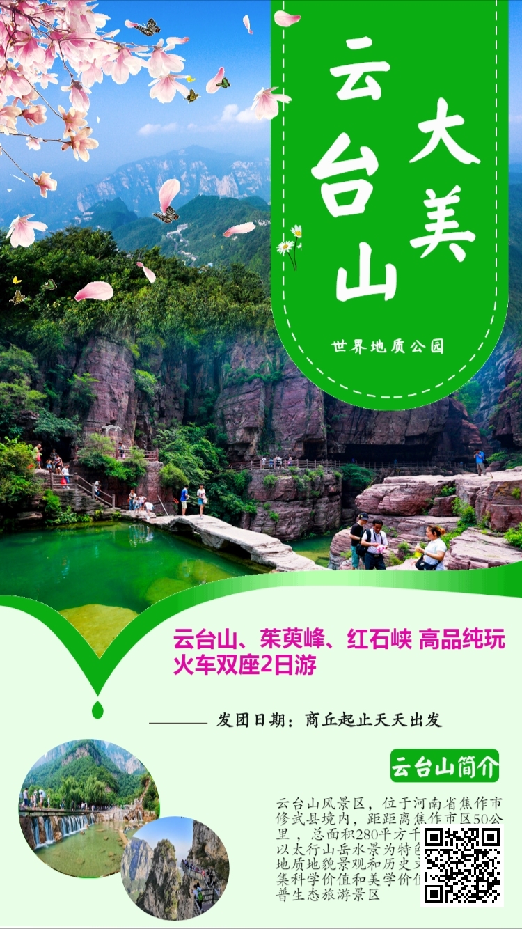 河南--焦作云台山、茱萸峰、红石峡 高品纯玩2日游 火车双座商丘起止天天发团