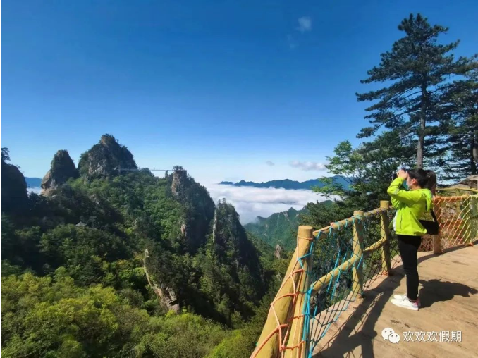 早餐后游览:西峡最大综合景区老君洞,相传曾为老子的归隐之地,冰爽清凉,感受最狭窄的连环溶洞群:青牛洞、打铁洞(约1.5-2小时)。后游览中原唯一一个不用遮阳帽的“太清谷”,森林茂密,环翠瀑布、翡翠谭等景观一路与水共舞,自费挑战森林飞车。游览:野人谷,瀑布四季川流不息,旋天栈道被不少游客赞叹为人间奇迹,它全长两千多米,最高海拔1490米全部修建在悬崖绝壁之上,以险、高、奇、长、仿生、坚固而驰名中原,被誉为“中原第一栈道”。结束后乘车前往老界岭,抵达后乘坐景交(30元已含)游览云中文斋,锯齿峰,骆驼峰,观赏太阳落山风景,
