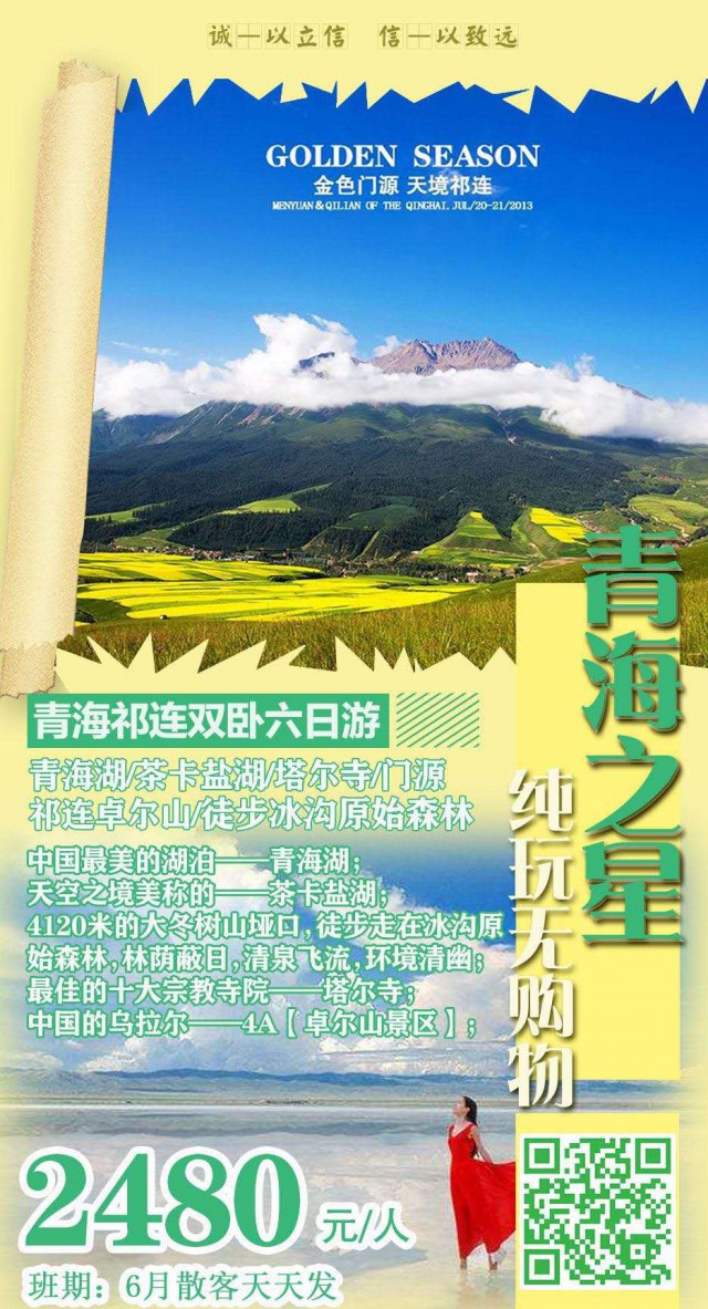 青海湖/茶卡天空壹号/祁连卓尔山/徒步/门源品质双卧6日游超值体验、超值享受