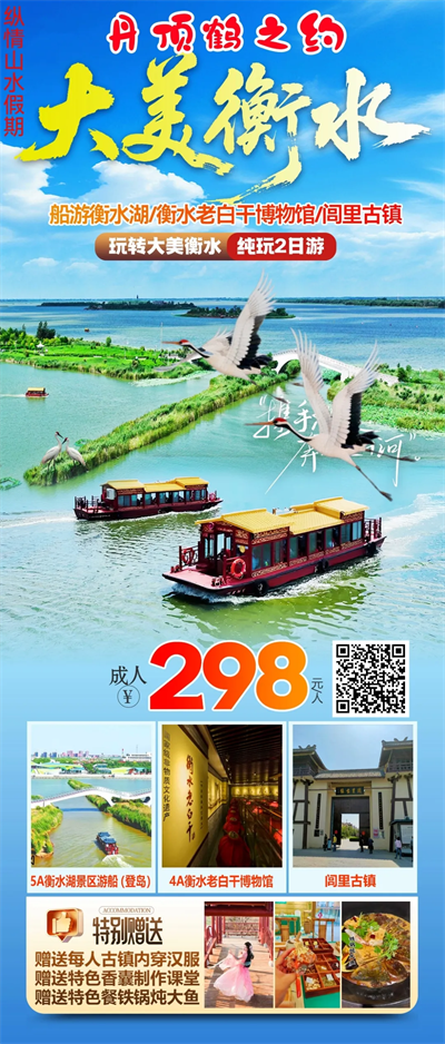 河北--【特价298丹顶鹤之约】5A衡水湖+船游三生岛/梅花岛+4A衡水老白干景区+4A闾里古镇纯玩2日游