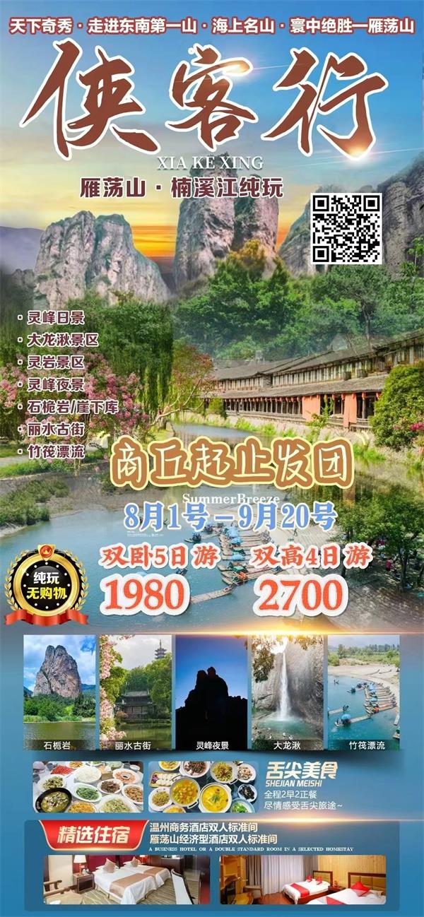浙江--A1线侠客行:雁荡山、楠溪江、灵峰日景、大龙湫景区、灵岩景区、灵峰夜景、丽水古街(0购物0必消)火车双卧7日游、双高6日游、双飞6日游、商丘起止发团